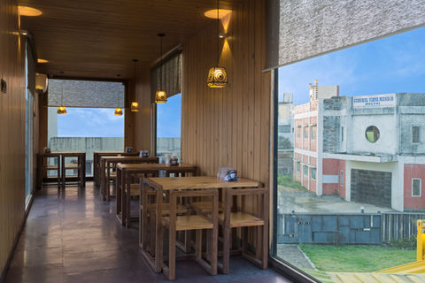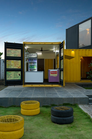 Taking inspiration from the trends of Cargotecture, shipping containers have been chosen as the key design element. The cafe’s space-making came about due to a grid-like composition of two, industrial-grade 8x40 feet high containers; a yellow container having been placed on a low plinth in the southwest corner of the plot, wrapped around a tranquil and welcoming courtyard, with the black container cantilevered above, deviating from the grid.
